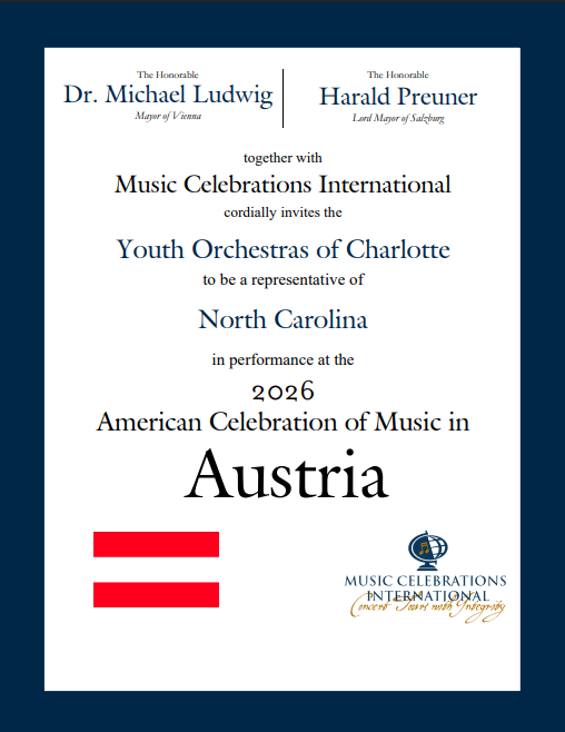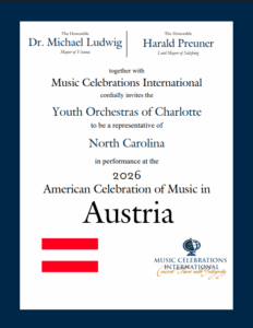 The Youth Orchestras of Charlotte is thrilled to announce its first ever international tour, taking place in Summer 2026, with performances in two of Europe’s most iconic musical cities: Salzburg and Vienna, Austria!